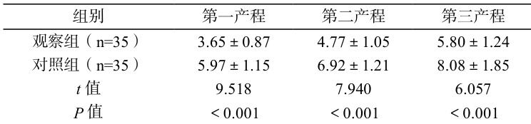 观察组第一、二、三产程 VAS 评分低于对照组( P<0.05 )。见表 1。