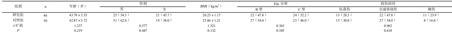 1.1 基线资料 回顾性分析20 骨折患者临床资料,随机选取50 例纳入对照组;回顾性分析同期 料,随机选取46 例纳入研究组。纳入标准:①经影像学资料确诊为 5 岁者;④病例资料完整者;⑤对本研究知情同意者。排除标准: 性骨折者;④依从性较差,无法遵医嘱进行术后锻炼者;⑤因骨折造成神经功 再次骨折者。两组患者基线资料比较无明显差异 (ΦP>0.05) ,具有可比性,见表1
