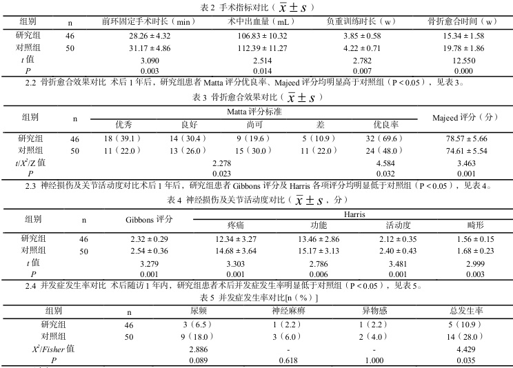 1.3 观察指标 (1)手术指标:统计两组患者前环固定手术时长、术中出血量、负重训练时长、骨折愈合时间。(2)骨折愈合效果:于两组患者术后随访1 年后,采用Matta评分标准[5]评估患者骨折复位效果,其中骨折移位最大距离≤4mm 为优秀,5\~9mm 为良好,10\~19mm为尚可,≥20mm 为差,优良率=(优秀例数+良好例数)/总例数*100%;骨盆功能状态通过Majeed 骨盆功能评分[6]进行评估,总分0\~100分,得分越高说明患者骨盆功能恢复越好。(3)神经损伤程度:于两组患者术后随访1 年后,采用Gibbons 骶神经损伤评分[7]对患者骶神经功能进行评估,该评分系统总分1\~4 分,得分越高说明患者神经功能损伤越严重。(4)关节活动度:于两组患者术后随访1 年后,采用髋关节功能评分表[8](Harris)对患者髋关节功能进行评估,该量表包括疼痛、功能、活动度、畸形4 维度,各维度总分分别为0\~44 分、0\~47 分、 0~5 、0\~4 分,得分越高说明患者关节功能越好。(5)并发症:统计两组患者术后1 年内并发症发生情况。