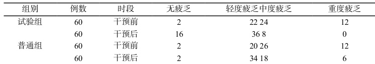 由表 1 可知,两组患者干预前癌因性疲乏程度接近 (P>0.05 ),干预后均有所改善,其中普通组患者中度疲乏改善为轻度疲乏情况较好,但依旧存在重度疲乏的问题。试验组患者则主要为无疲乏和轻度疲乏,改善效果好于普通组(P<0.05)。