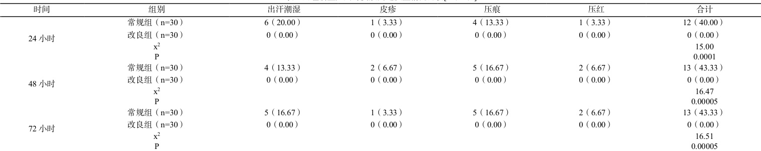 观察并记录两组新生儿在佩戴腕带后 24h、48h、72h 的局部皮肤情况,包括出汗潮湿、皮疹、压痕、压红等护理问题发生例数。出汗潮湿定义为腕带下皮肤有明显汗珠或呈现潮湿状;皮疹为局部皮肤出现红色斑丘疹;压痕是皮肤表面有明显凹陷痕迹;压红指解除腕带后皮肤发红持续 15min 以上。同时记录两组新生儿腕带自行脱落例数,腕带完全脱离新生儿肢体即判定为脱落。