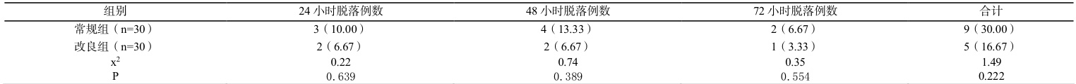 尽管改良组腕带脱落率低于常规组,但差异无统计学意义。可能原因包括:①样本量较小,统计效力不足; ② 橡皮筋佩戴方式需进一步优化固定方法,以增强稳定性。