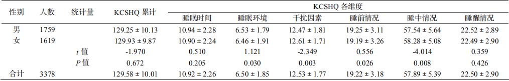 入托儿童问卷(KCSHQ)总累计分值为( 129.58±10.01 ),研究对象存在睡眠问题的发生率为 0.42% ,不同性别间比较未发现入托男童和女童问卷累计分值、睡眠问题发生率存在统计学差异( P>0.05 )。