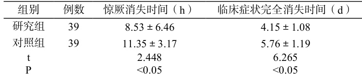 2.1 两组惊厥消失时间及临床症状完全消失时间比较