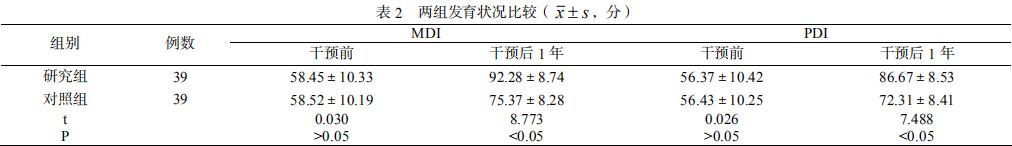 对比 MDI、PDI,干预前组间差异不明显( P>0.05 );干预后 1 年两组两项数值均有提升,研究组均提升至比对照组更高的水平( P<0.05 )。见表 2。