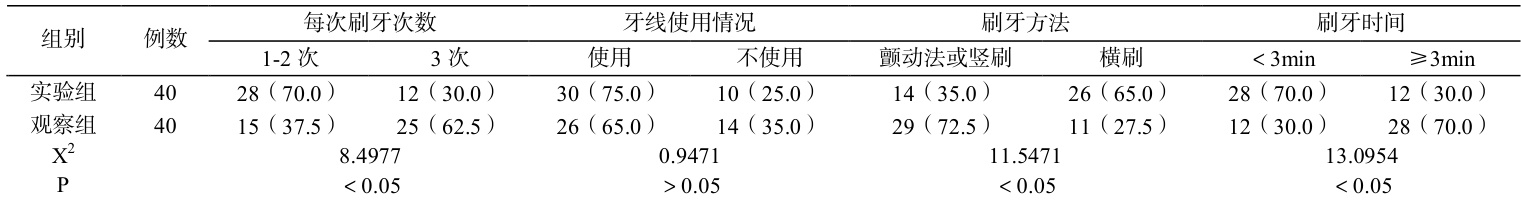 如表 1,观察组每次刷牙次数(3 次)、刷牙方法(颤动法或竖刷)、刷牙时间( ⩾3min )明显优于实验组, P<0.05 。而牙线使用情况使用对比P>0.05 数据差异不存在统计学价值。