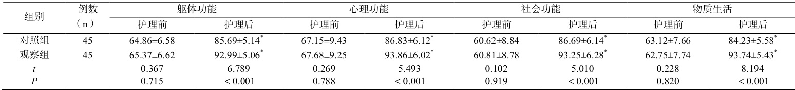 护理前两组生活质量无显著差异( P>0.05 ),护理后,观察组各指标评分显著高于对照组( P<0.05 )。见表 2。