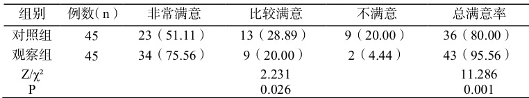 对比对照组( 80.00% ),观察组对护理的满意度( 95.56% )更高( ρP<0.05 )。见表 3。