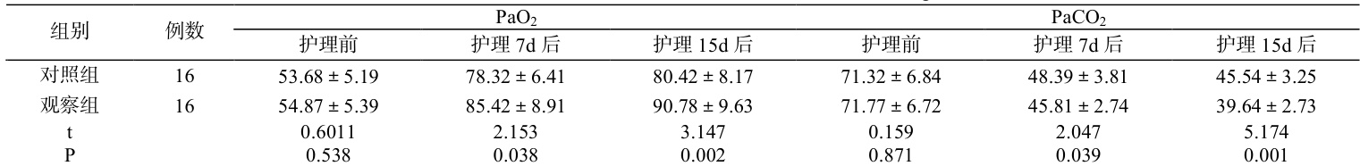 对比两组患者护理前、护理 7d 及护理 15d 后的各项血气分析指标,包括 PaO2、PaCO2。