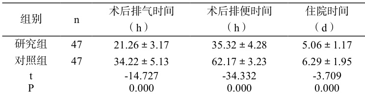 对照组中的 47 例患者给予常规的护理方法。研究组中的 47 例患者则实施快速康复护理措施。