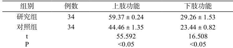 (1)护理干预后患者的肢体运动功能情况。以 Fugl-Meyer 量表评估,有上肢功能和下肢功能之分,评分越高,为肢体运动功能越好。(2)患者对护理工作的满意度。以自制问卷调查,有非常满意、满意、不满意之分,满意度为非常满意率和满意率之和。