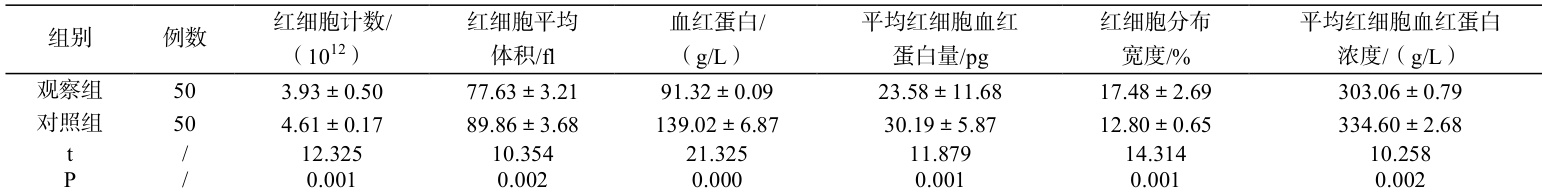 时间范围是 2024 年 1 月到 2024 年 3 月,调研人群是在我院就诊妊娠期贫血患者 50 例和健康孕妇 50 例,分别为观察组和对照组。观察组中,年龄区间[24,38],平均值( 30.54±2.23 )岁;对照组中,年龄区间[24,37],平均值( 29.02±2.46 )岁。
