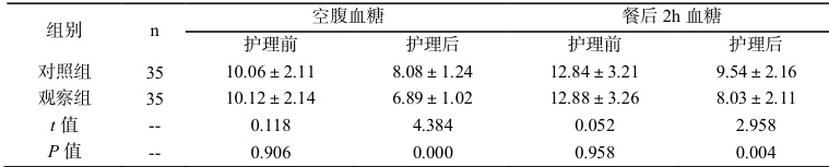 2.2 比较两组血糖水平与护理前比,护理后血糖水平下降且观察组空腹血糖、餐后 2h 血糖低于对照组 P<0.05 )。见