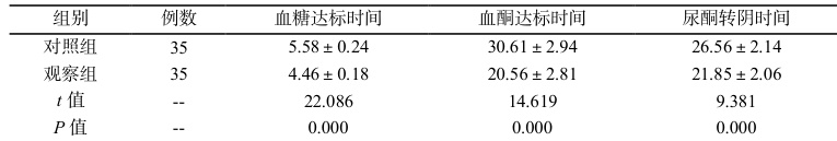 选取 2022 年 3 月—2023 年 10 月收治的 70 例糖尿病酮症酸中毒患者研究。随机分 2 组。对照组(35 例):女 15 例、男 20 例,年龄 44\~80 岁,平均( 60.24±3.41 )岁;糖尿病病程 1\~8 年,平均(4.11±0.26 )年;DKA 病程 2\~8h,平均( 4.51±0.22 ) h 。观察组(35 例):女 16 例、男 19 例,年龄 45\~80岁,平均( 60.22±3.44 )岁;糖尿病病程 1\~8 年,平均( 4.16±0.24 )年;DKA 病程 2\~9h,平均(4.64±0.18 ) h 。两组 4 项资料比较 P>0.05 ,可比。