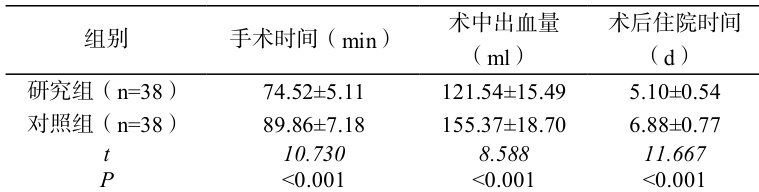 研究组手术时间、术中出血量、术后住院时间均少于对照组,数据组间对比存在统计学意义( P<0.05 ),表 1。