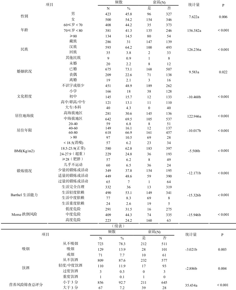 923 例患者发生衰弱 250 例(27.09%)。年龄、性别、婚姻状况、文化程度、居住地海拔、居住年限、BMI、锻炼情况、Barthel生活能力、Morse 跌倒风险变量、吸烟、饮酒、营养风险筛查总评分与患者衰弱发生率的差异有统计学意义(P<0.05),见表 1。表1 青海地区老年人衰弱的单因素分析和基本情况统计表