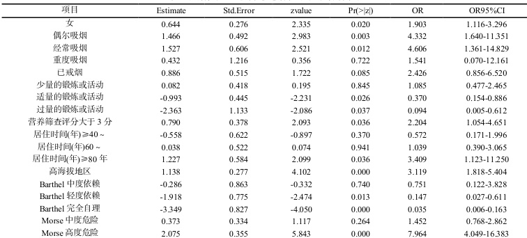 注:标a 为卡方检验,b 为Wilcox 秩和检验,p 值保留三位小数。2.2 影响青海地区老年住院患者衰弱的Logistic 回归分析将是否发生衰弱作为因变量(1=是,
