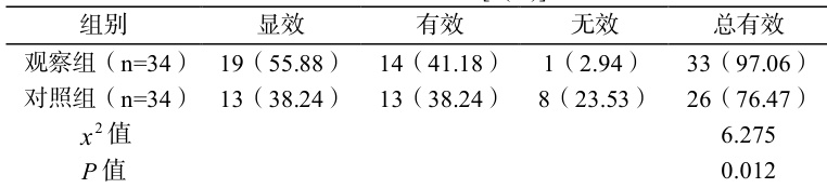 观察组治疗有效率高于对照组( P<0.05 )。见表 1。
