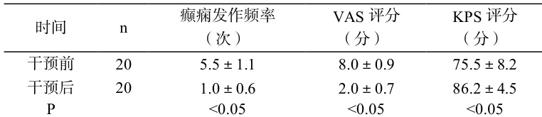 干预后患者癫痫发作频率、VAS 评分、KPS 评分显著优于干预前( P<0.05 )。见表 1。