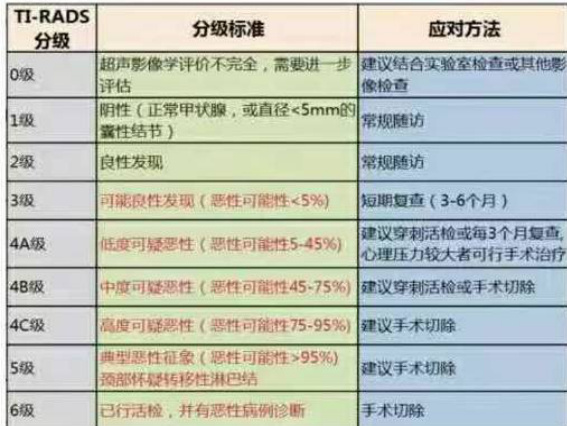 许多患者在体检后后阅读报告时,常常不理解甲状腺超声诊断中 TI-RADS分级的含义,在此小编对不同分级以及各分级的应对方法做成图表,便于医生们向患者进行解释说明。