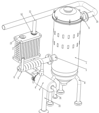 该减排装置主要由高温袋滤器、换热器、预混筒、旋转减速机构、旋转混合机构、活动式敲击机构及各类管道组成。高温袋滤器侧面设有进气口和出气口,出气口连接回气管,回气管下连烟气支管;换热器上有进气接头和空气进入接头,烟气支管接进气接头,换热器下有出气接头和空气排出接头,空气排出接头连空气管道[4];空气管道另一端连旋转混合机构,旋转混合机构外有预混筒,预混筒背面连旋转减速机构,旋转减速机构上连烟气延伸管(接换热器出气接头),下连连接管;旋转混合机构上设有活动式敲击机构,预混筒通过中间管连天然气管道,天然气管道内套尾气管道,尾气管道接高温袋滤器的进气口。