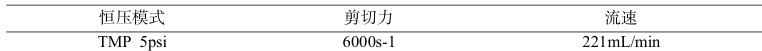 澄清料液使用中空纤维柱(截留孔径300kd,科百特 HFELAMO451030P)在切向流(英赛斯)设备上浓缩,设置参数见表 1;浓缩 10 倍后使用 0.2μm 滤器(科百特)过滤除菌,控制流速,前端压力达到14.5psi 时更换滤器,直到过滤结束。