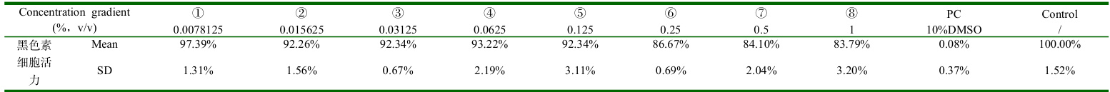 PRAEVLP 在角质形成细胞和成纤维细胞中表现出低毒性,最大1%浓度细胞活力仍 >95% ;在黑色素细胞和巨噬细胞中表现出低毒性,细胞活力 >90% 的安全浓度分别为 0.125% 、 0.0625% 。