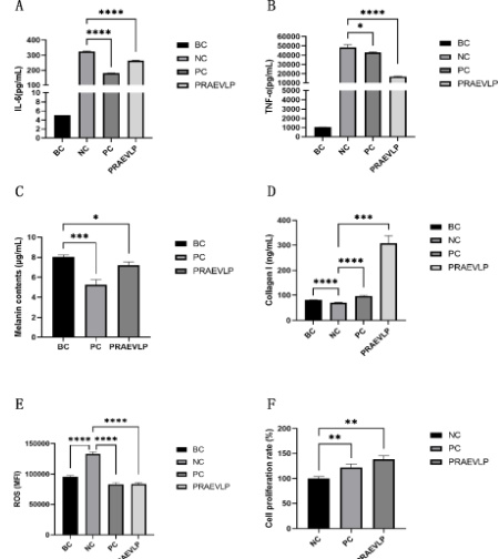 抗氧化效果:NC 组 ROS 含量显著上升,证明刺激条件有效。PC 组(VE)ROS 含量显著下降,阳性对照有效。PRAEVLP 组 ROS 含量显著下降,抑制率为 37.04% ,P 值 <0.001 (图 3E),表明 PRAEVLP 具有抗氧化作用。