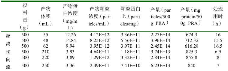 使用切向流设备进行 PRAEVLP 多批次生产,与超离法进行对比,评估两种方法产量、稳定性、经济性,评价结果详见表 so