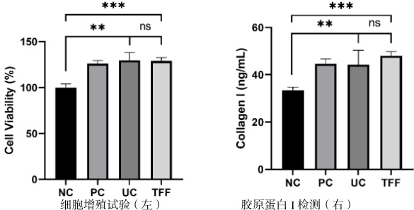 为了便于功效对比,选择 PRAEVLP 最具代表性的促增殖和促胶原蛋白 I 生成的功效进行对比评价(见图 5),以检验切向流超滤法和超离法提取的 PRAEVLP 是否有功效差异。结果显示,超离法和TFF 法提取的 PRAEVLP 均能显著促进成纤维细胞增殖和胶原蛋白 I 分泌,二者之间效果无显著差异。