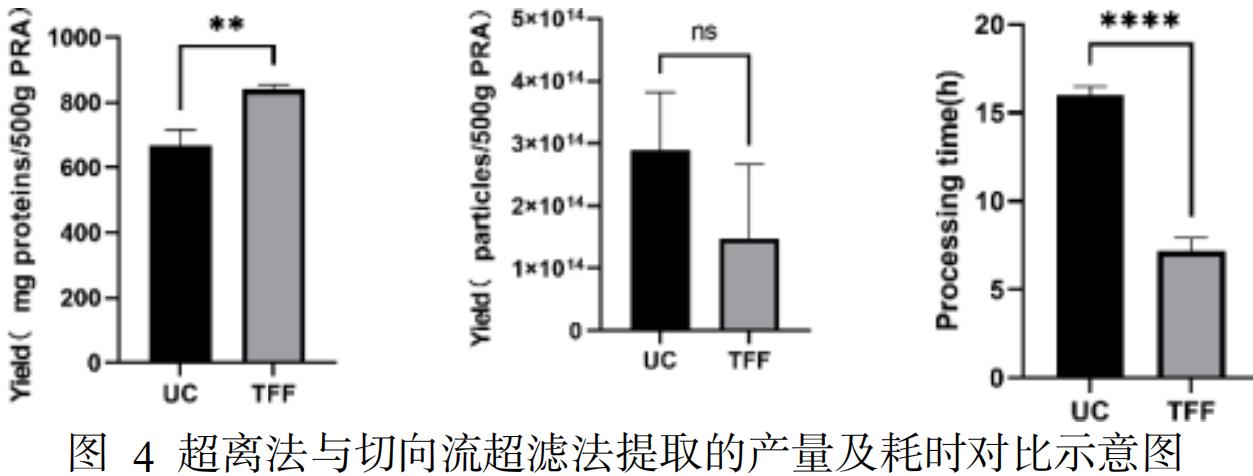 切向流超滤法的 PRAEVLP 颗粒产量与超离法相当,蛋白产量高于超滤法(有统计学差异 P<0.0