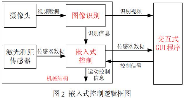 嵌入式控制采用基于 Cortex-A9 内核的 i.MX6Quad 处理器,定制Linux 系统。通过编写业务逻辑代码,实现激光测距传感器数据收发、伺服电机控制、图像识别信息处理、交互式 GUI 程序通信等。嵌入式控制功能逻辑框图如图 2 所示。