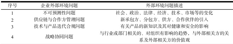 由于企业经营业务不同,所处的外部环境也不同,所以这就增加了项目认证分析的难度,项目需要对其外部环境进行全面分析和研究。如表1 所示,企业外部常见的环境问题包括不可预测性问题、供应链与合作方管理问题、技术与产品迭代合规问题、战略协同问题等方面。为加强企业外部环境方面的检查与审核,项目人员制定了动态监测方案,通过密切监测法律法规、政策调整、社会经济、技术升级等宏观环境变量,量化其外部环境风险对企业生产的影响,提高审核监测的准确性。为加强其他外部环境分析,项目还采用了合作方资质审核、全生命周期风险评估,PDCA 循环持续改进措施等。