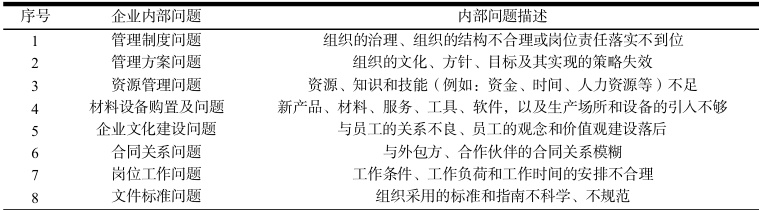 如表2 所示,生产制造企业常见的内部问题包括管理制度问题、管理方案问题、资源管理问题等,这些内部问题覆盖了企业管理的方方面面,也成了管理体系认证审核中的难题之一。为此,对于企业内部问题的研究,项目重点采用了一体化文件审查方式,主要检查工作手册是否涵盖环境因素和影响识别、职业危害识别等条款内容;程序文件是否重复[3]。此外,评针对工作环境和基础设施、办公室活动、产品采购等过程的操作规划和控制效果进行评估,并系统性检验制度方案的科学合理性、岗位责任的匹配性、合同关系的合规性、文化建设的有效性等。通过员工访谈和活动记录等方式,进一步了解企业文化建设情况。最后对改进措施的有效性进行验证,确保企业内部管理体系认证全面、合规、准确、合理。