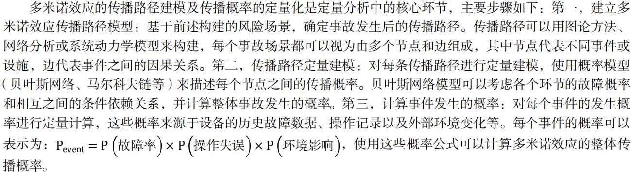 多米诺效应的定量分析依托于风险传播模型和概率计算框架。定量分析方法的基本框架有以下几个步骤:第一,事件识别:识别关键设备、工艺环节和可能发生故障的危险源。第二,传播路径分析:确定多米诺效应的传播路径,分析故障如何从一个系统传递到另一个系统。第三,传播概率计算:基于事件的发生概率和影响范围,计算事故在不同环节间传播的可能性,传播概率的计算公式通常基于以下关系式: