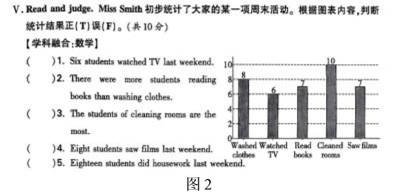 任务情境打破学科界限,融合英语与劳动、数学等学科,考查学生用英语解决实际问题及独立运用学习方法的能力。[1]例如图 2,将英语与数学统计深度融合,以英语呈现含周末活动及对应人数的统计图表。学生需先读懂英语标注的活动与统计信息,再用数学的数据分析、数量比较等方法,对“Six students watched TV...”等陈述推理验证,锻炼学生逻辑思维能力,实现跨学科思维进阶。