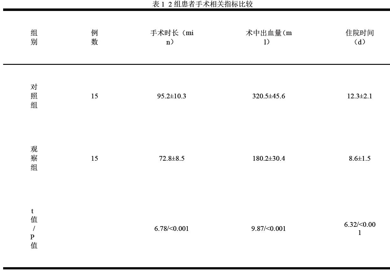观察组手术时长、出血量、住院时间均显著低于对照组(P<0.05),见表 1。