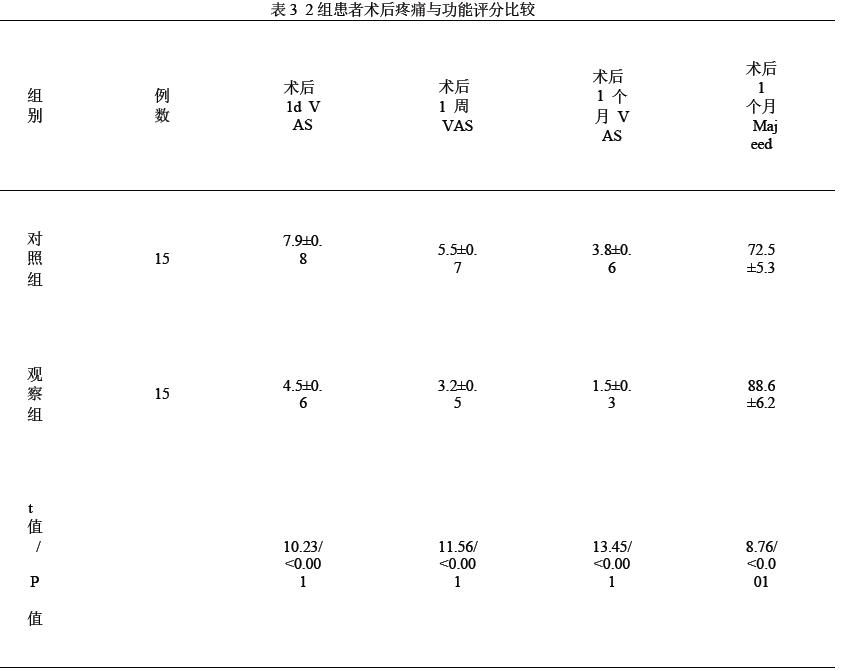 功能评估:术后 1d、1 周、1 个月行 VAS 疼痛评分(0-10 分),术后 1 个月行 Majeed 功能评分(0-100分,分值越高功能越好)。