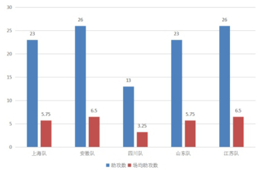 结合图中数据,可以看到上海队总助攻数排名第三,较安徽队、江苏队少了3 次助攻。与山东队持平,高于四川队的13 次助攻。由此可见,上海队在助攻方面同样排名较低,仅高于四川队,相对于其他四支球队而言,在助攻方面并无明显优势。上海队还需提高整体进攻配合能力,充分发挥自己的攻击能力,同时又能够为队友创造进攻机会,提升助攻能力。