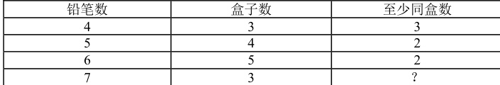 举例验证:7 支铅笔放入3 个盒子 7÷3=2 ……1→至少 2+1=3 支同盒。