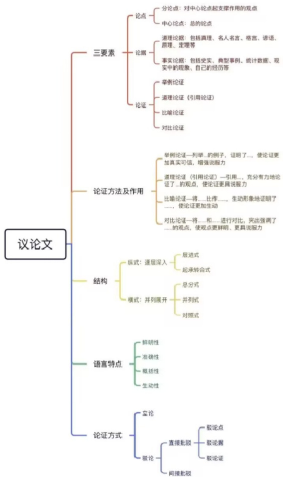 在指导学生提升写作技能的过程中,构建写作支架至关重要。教师可以通过展示优秀文章、提供写作范式、指导写作流程等手段,为学生搭建必要的写作辅助,减轻写作难度,帮助他们逐渐习得写作技能。以初中语文九年级上册第五单元“议论文写作”为例,在指导学生写作时,教师要巧妙运用思维导图,为学生构建起有效的写作框架。在此过程中,教师需突出文章的核心观点——即中心论点,并指导学生领悟其在全文中的统领作用。接下来,教师应深入解析分论点的作用,它们是支撑中心论点的基石,使文章结构更加坚固。在论据的选择上,教师不仅需介绍事实论据和道理论据这两种基本形式,还需借助思维导图呈现它们的具体内容,例如历史事实、典型实例、名人引语等,以丰富学生的写作素材。同时,教师可传授多样的论证方法,如举例论证、道理论证、比喻论证及对比论证,并对其效果进行逐一分析,如提升说服力、增强论证的生动性等。除此之外,教师还需关注议论文的架构和语言特征,例如层进式、并列式等结构,以及语言的鲜明性、准确性等要求。凭借这些细致的指导和高效的思维导图,学生不仅能掌握写作技巧,还能在写作实践中灵活应用,逐步提升自身的写作水平。如下文的思维导图: