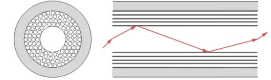 示意图:空心光缆结构(空气纤芯 + 微结构包层)及光子带隙导波路径。