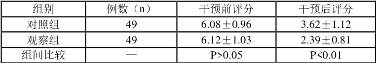 (2)疼痛程度:干预前后采用视觉模拟评分法 NRS,对应 0 分\~10,分值越大疼痛越严重;