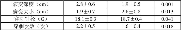 将患者按是否发生并发症分组,分析性别、年龄、体位、病变部位、病变大小、病变深度、穿刺针径、穿刺次数等因素,结果显示病变深度、病变大小、穿刺针径和穿刺次数与并发症发生率相关( P<0.05 )。见表 1。