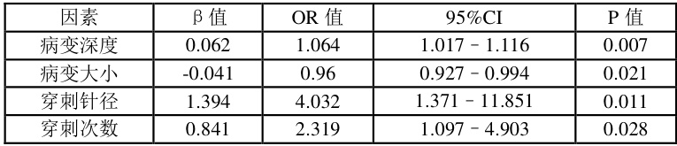 将单因素分析中具有统计学意义的变量(病变深度、病变大小、穿刺针径、穿刺次数)纳入 Logistic 回归模型,结果显示病变深度、病变大小、穿刺针径、穿刺次数为 CT 引导下肺穿刺活检术后并发症的独立危险因素。