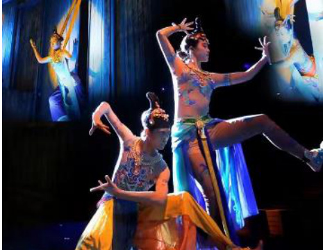 场景化体验设计让敦煌文化走出展柜,融入大众生活。文旅融合项目通过沉浸式剧场与光影秀重构文化体验,如《又见敦煌》以行进式演出形式(如图 2),观众跟随演员穿梭于不同时空场景,亲历丝绸之路的繁华与壁画背后的故事;数字光影秀利用全息投影技术,在石窟外墙投射动态敦煌纹样,使古老建筑在夜色中焕发新生。在公共空间领域,机场、地铁站等场所成为文化传播的新窗口。例如,某城市地铁站以敦煌藻井为设计原型,打造穹顶艺术装置,乘客抬头即可观赏到 3D 打印的立体纹样;机场候机区设置互动投影墙,旅客通过手势操作,可让墙面的飞天纹样产生动态变化,将日常出行场景转化为文化体验空间,实现敦煌文化的广泛传播与渗透。