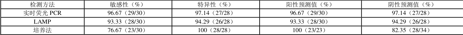 以细胞培养结果为参考标准,计算实时荧光 PCR、LAMP、培养法的敏感性、特异性、阳性预测值、阴性预测值。
