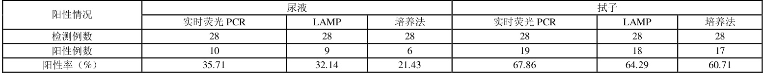 尿液标本中,PCR 阳性率显著高于培养法( x2=4.321 , P<0.05 );拭子标本中,PCR 与 LAMP 的阳性率相当( x2=0.235 , P>0.05 )。同时,尿液、拭子标本中,PCR、LAMP 的阳性率均显著高于培养法 (P<0.05) 。见表 2。