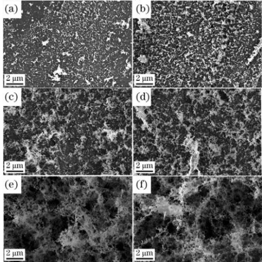 图 2 不同激光功率下在聚酰亚胺(PI)膜表面进行激光诱导石墨烯(LIG)片材料的扫描电镜图像(a)1.8W(b)2.0W(c)2.2W(d)2.4W(e)2.6W(f)2.8W