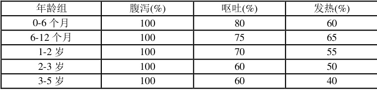 腹泻是最常见的临床症状,发生率为 100% 。呕吐在 70% 的患者中出现,发热的发生率为 60% 。腹痛在 50% 的患者中发生。